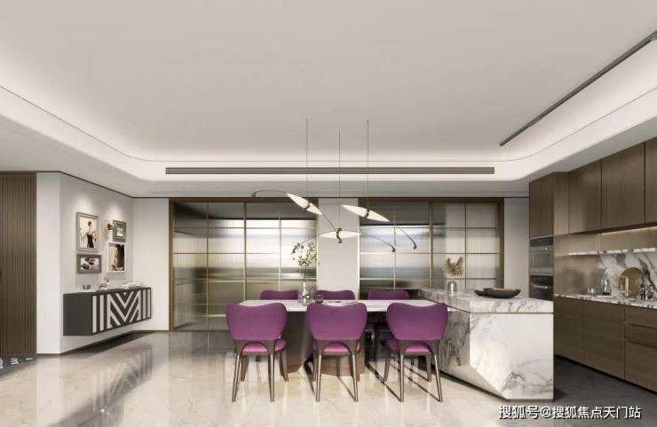 在客厅另一侧,连接客厅和厨房的岛台,LDKG一体化,进一步放大整体空间社交属性.营造N+种居家与聚会场景,让横厅的社交属性得到充分放大.