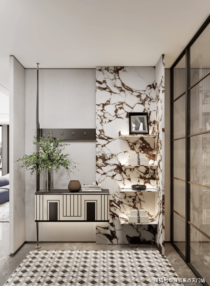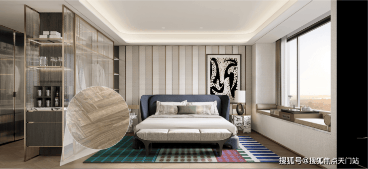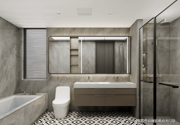 卫生间里的弧形镜、地面拼花、金属复古移门...各个空间都呈现出细节的精致感.