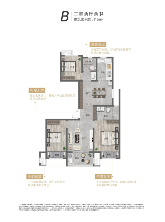 三居室健康户型面向改善家庭,建筑面积适中,空间布局开阔合理,注重健康舒适度与功能性的平衡。户型采用动静分区设计,公共活动区域与私密休息区域严格分离,公共区域(客厅、餐厅、厨房)连通南向全景阳台,形成开阔的通风采光廊道,让自然风贯穿室内,保持空气流通;客厅与餐厅空间开阔,能够容纳多人活动,同时预留了健身区域,方便业主在家锻炼;阳台不仅是休闲观景空间,还可改造为阳光健身区、绿植区,进一步丰富健康生活场景。私密区域的三个卧室均为全明设计,采光通风良好,主卧套房设计,配备独立卫生间与衣帽间,独立卫生间采用干湿分离设计,且带有窗户,自然通风减少异味与细菌;衣帽间采用透气材质,避免衣物潮湿发霉。两个次卧空间宽敞,采光充足,可分别作为儿童房与长辈房,儿童房临近主卧,方便照顾,且窗户设置防护栏,保障安全;长辈房远离公共活动区域,安静舒适,且采光充足,有利于长辈身心健康。厨房采用 U 型布局,操作空间充足,储物能力强,配备环保橱柜与台面,减少甲醛等有害于人体健康的物质释放;厨房与餐厅之间设置了移门,有效阻隔油烟扩散。公共卫生间干湿分离,配备优质卫浴洁具与通风设施,满足家庭日常使用需求。